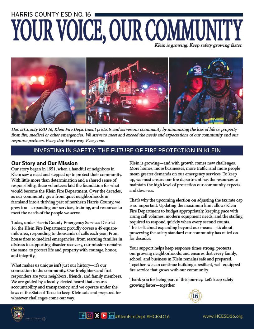 Download the "2026 Your Voice Our Community" booklet to learn more about Klein's growth and Klein Fire Department's commitment to our area's safety.